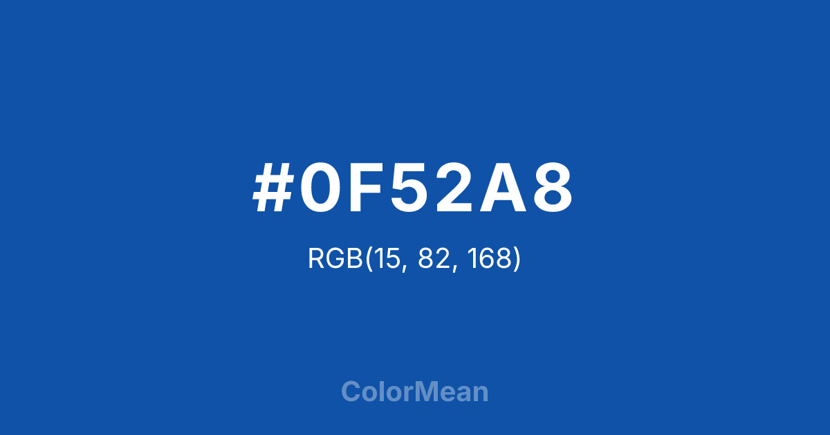 #0F52A8 RGB value is (15, 82, 168). The hex color red value is 15, green is 82, and blue is 168. Its HSL format shows a hue of 214°, saturation of 84 percent, and lightness of 36 percent. The CMYK process values are 91 percent, 51 percent, 0 percent, 34 percent.