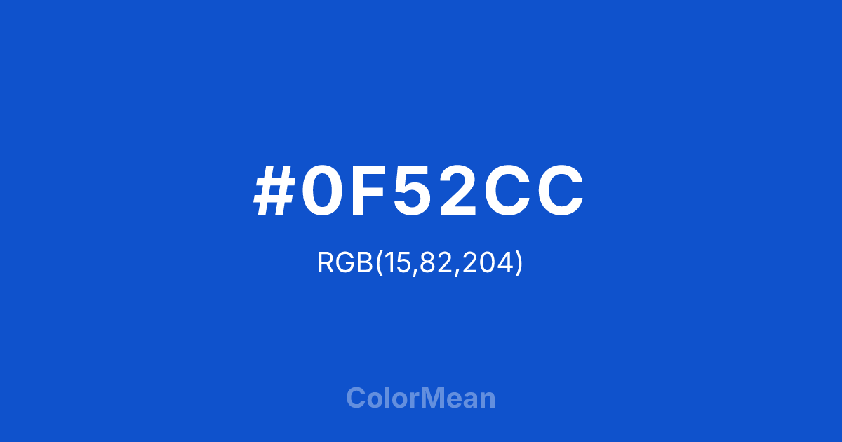 #0F52CC RGB value is (15, 82, 204). The hex color red value is 15, green is 82, and blue is 204. Its HSL format shows a hue of 219°, saturation of 86 percent, and lightness of 43 percent. The CMYK process values are 93 percent, 60 percent, 0 percent, 20 percent.