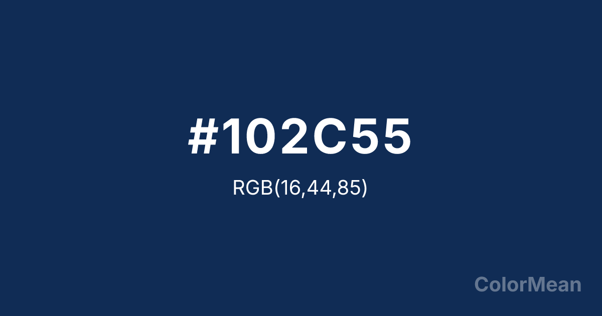 #102C55 RGB value is (16, 44, 85). The hex color red value is 16, green is 44, and blue is 85. Its HSL format shows a hue of 216°, saturation of 68 percent, and lightness of 20 percent. The CMYK process values are 81 percent, 48 percent, 0 percent, 67 percent.