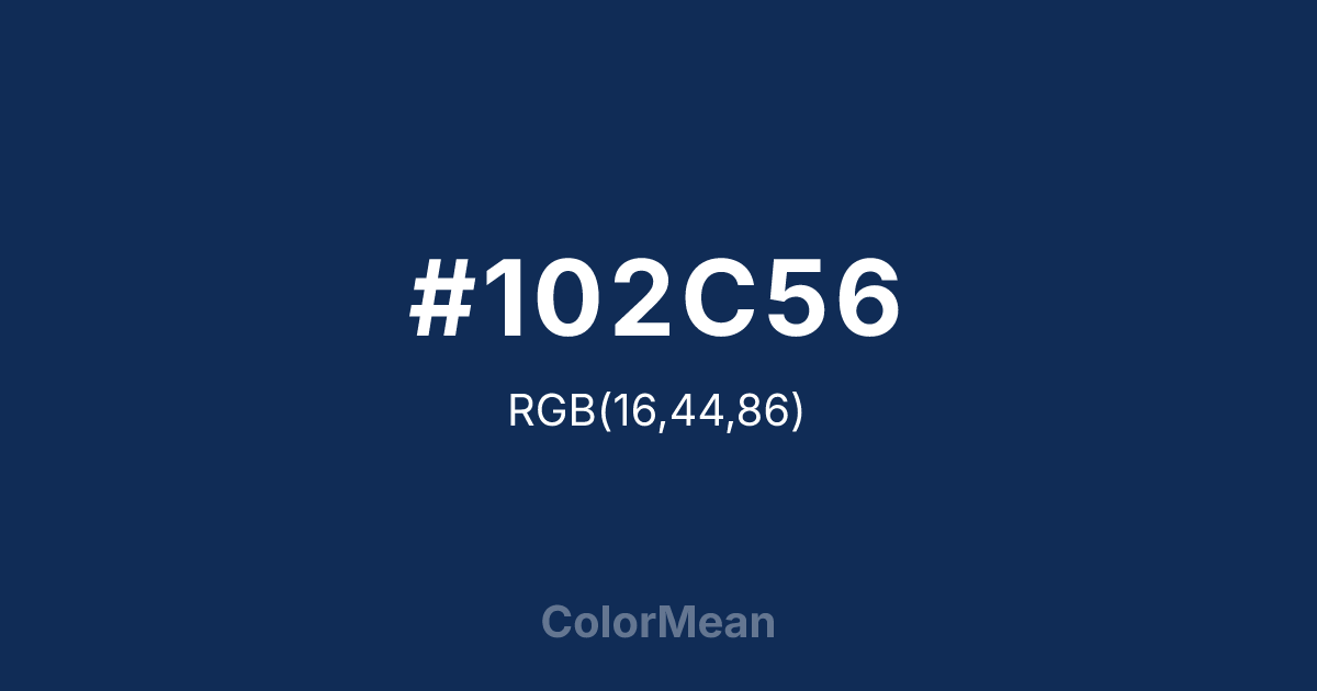 #102C56 RGB value is (16, 44, 86). The hex color red value is 16, green is 44, and blue is 86. Its HSL format shows a hue of 216°, saturation of 69 percent, and lightness of 20 percent. The CMYK process values are 81 percent, 49 percent, 0 percent, 66 percent.