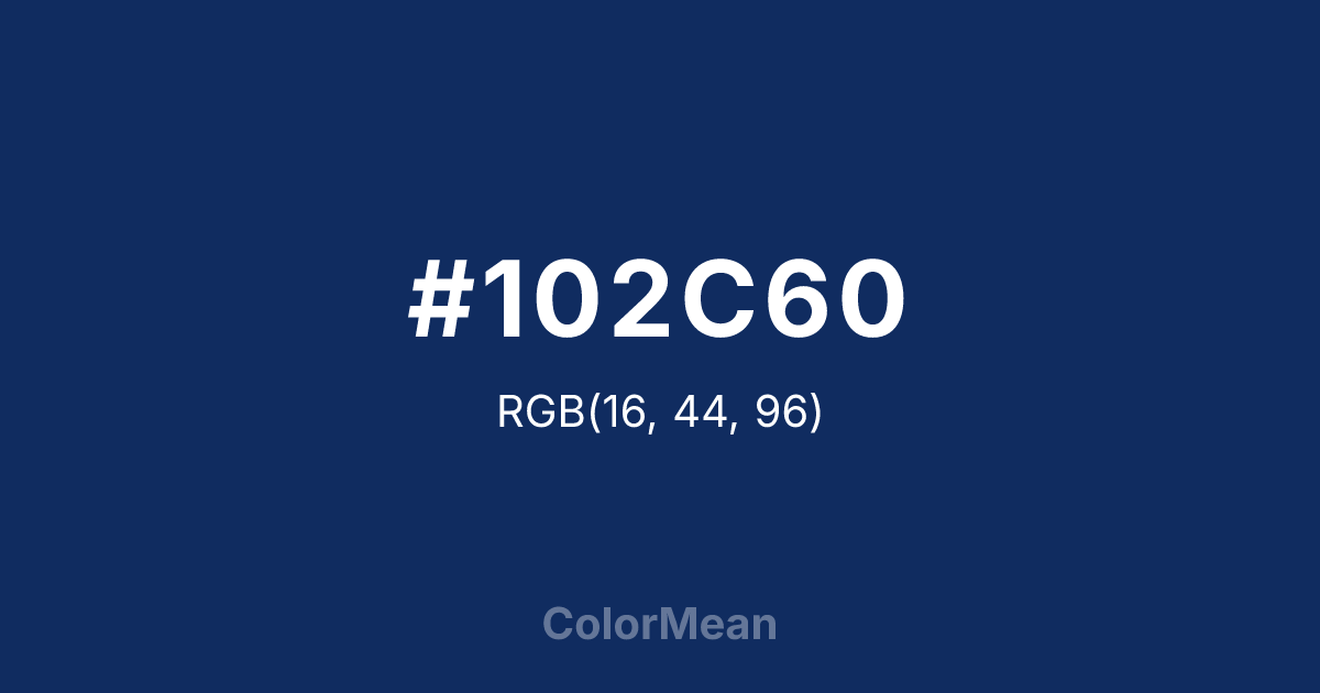 #102C60 RGB value is (16, 44, 96). The hex color red value is 16, green is 44, and blue is 96. Its HSL format shows a hue of 219°, saturation of 71 percent, and lightness of 22 percent. The CMYK process values are 83 percent, 54 percent, 0 percent, 62 percent.