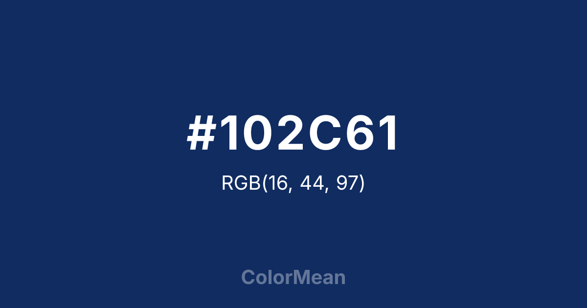 #102C61 RGB value is (16, 44, 97). The hex color red value is 16, green is 44, and blue is 97. Its HSL format shows a hue of 219°, saturation of 72 percent, and lightness of 22 percent. The CMYK process values are 84 percent, 55 percent, 0 percent, 62 percent.