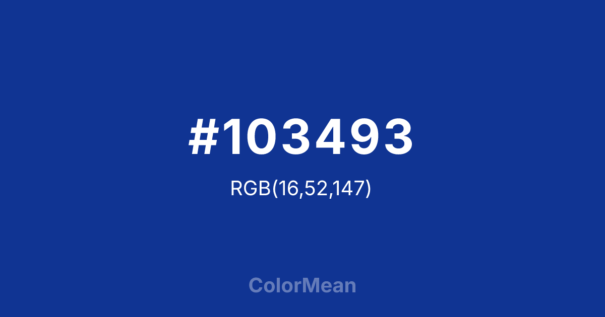 #103493 RGB value is (16, 52, 147). The hex color red value is 16, green is 52, and blue is 147. Its HSL format shows a hue of 224°, saturation of 80 percent, and lightness of 32 percent. The CMYK process values are 89 percent, 65 percent, 0 percent, 42 percent.