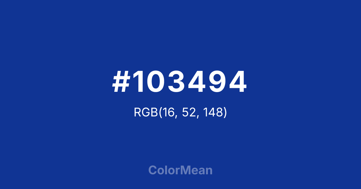 #103494 RGB value is (16, 52, 148). The hex color red value is 16, green is 52, and blue is 148. Its HSL format shows a hue of 224°, saturation of 80 percent, and lightness of 32 percent. The CMYK process values are 89 percent, 65 percent, 0 percent, 42 percent.