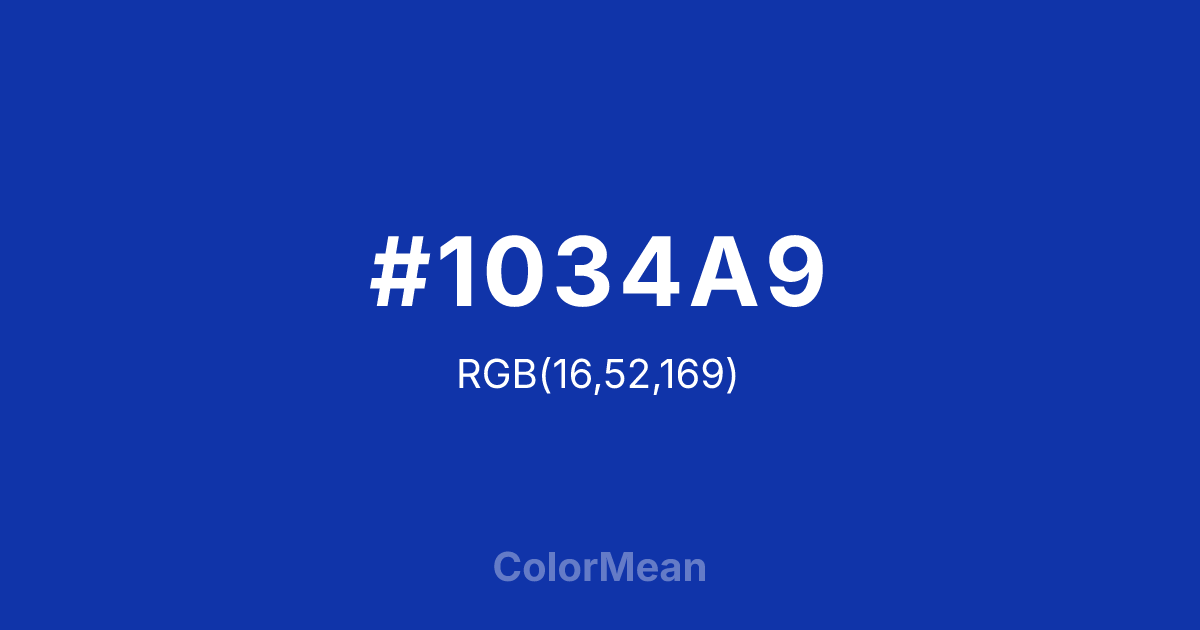 #1034A9 RGB value is (16, 52, 169). The hex color red value is 16, green is 52, and blue is 169. Its HSL format shows a hue of 226°, saturation of 83 percent, and lightness of 36 percent. The CMYK process values are 91 percent, 69 percent, 0 percent, 34 percent.
