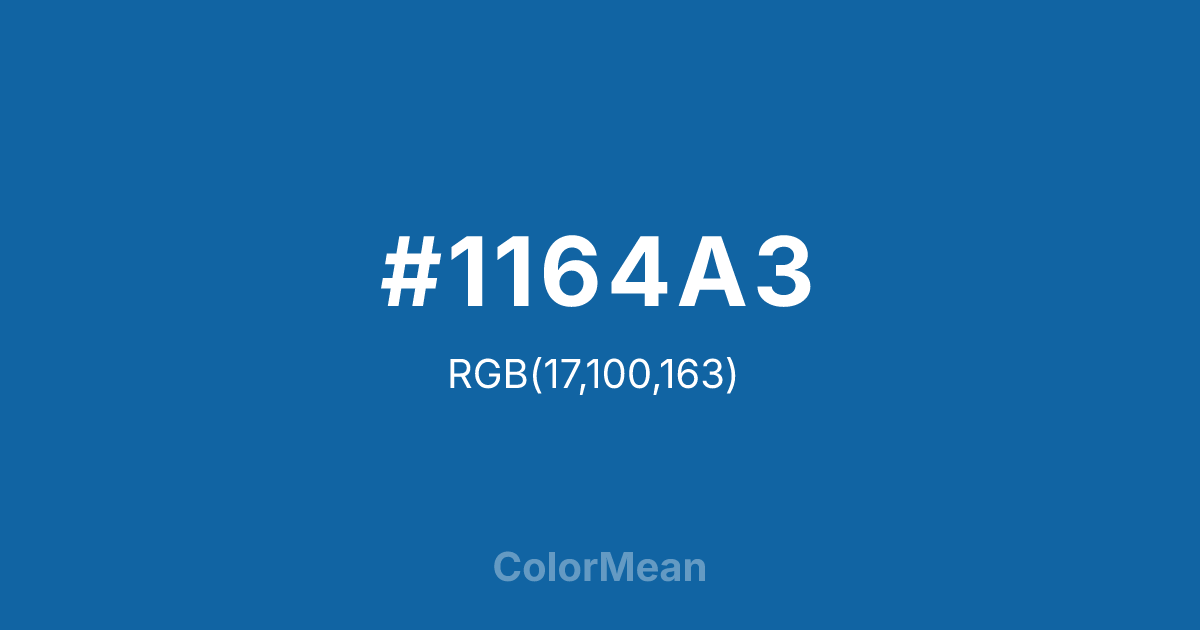 #1164A3 RGB value is (17, 100, 163). The hex color red value is 17, green is 100, and blue is 163. Its HSL format shows a hue of 206°, saturation of 81 percent, and lightness of 35 percent. The CMYK process values are 90 percent, 39 percent, 0 percent, 36 percent.