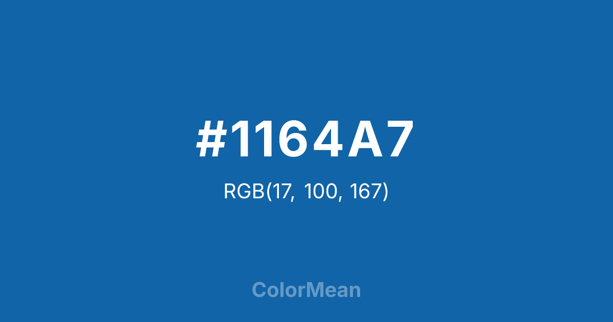 #1164A7 RGB value is (17, 100, 167). The hex color red value is 17, green is 100, and blue is 167. Its HSL format shows a hue of 207°, saturation of 82 percent, and lightness of 36 percent. The CMYK process values are 90 percent, 40 percent, 0 percent, 35 percent.