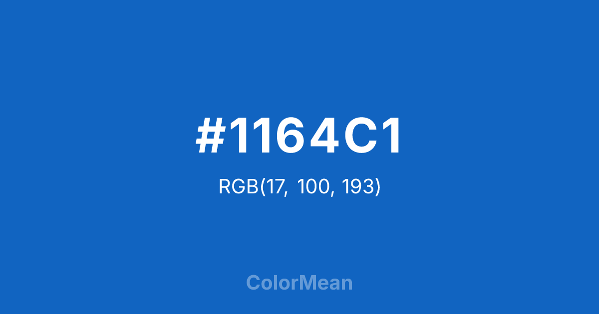 #1164C1 RGB value is (17, 100, 193). The hex color red value is 17, green is 100, and blue is 193. Its HSL format shows a hue of 212°, saturation of 84 percent, and lightness of 41 percent. The CMYK process values are 91 percent, 48 percent, 0 percent, 24 percent.