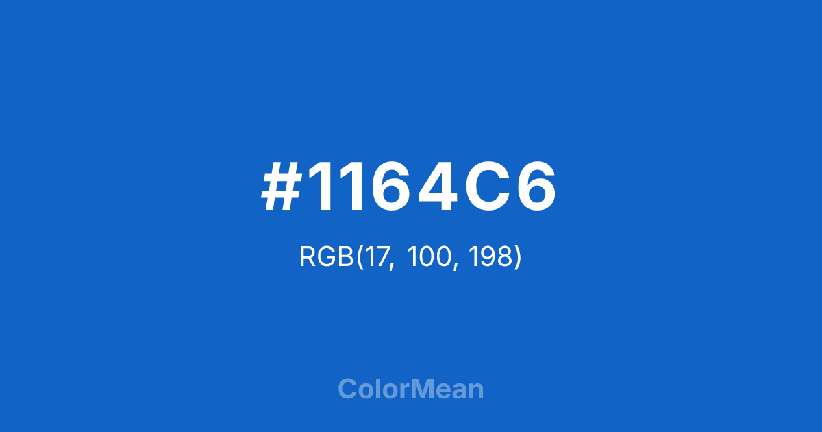 #1164C6 RGB value is (17, 100, 198). The hex color red value is 17, green is 100, and blue is 198. Its HSL format shows a hue of 212°, saturation of 84 percent, and lightness of 42 percent. The CMYK process values are 91 percent, 49 percent, 0 percent, 22 percent.