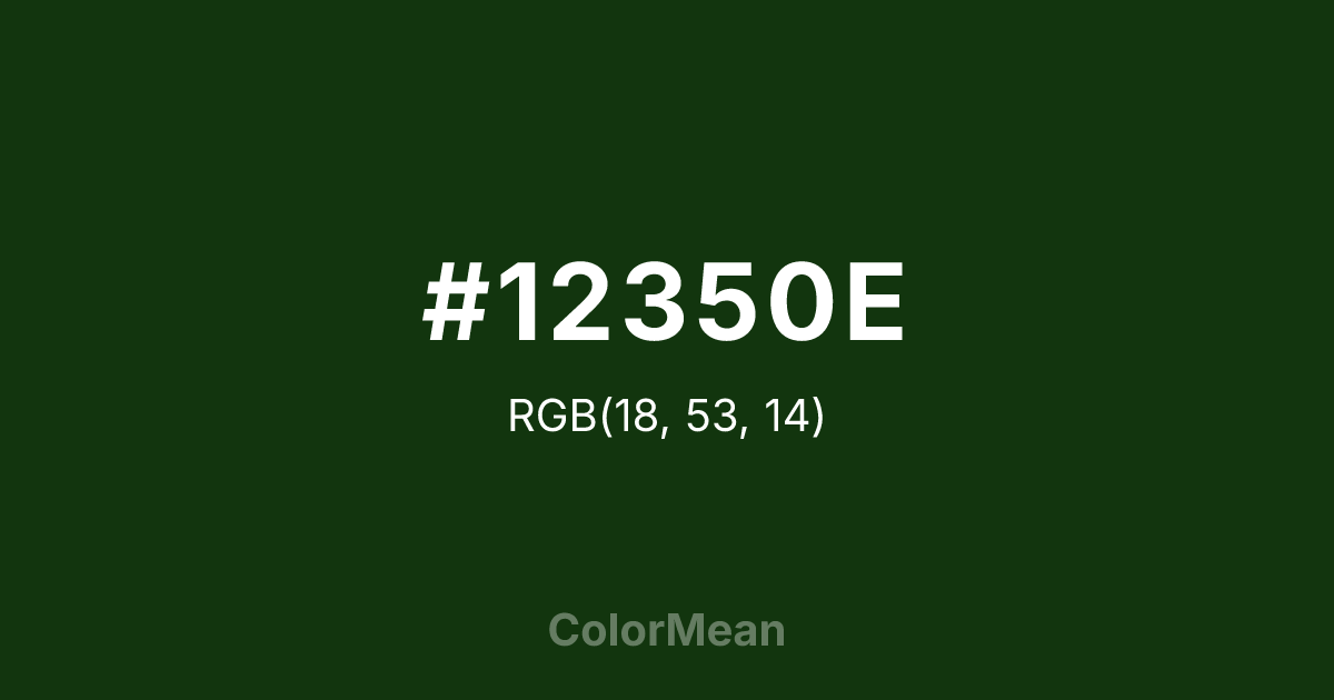 #12350E RGB value is (18, 53, 14). The hex color red value is 18, green is 53, and blue is 14. Its HSL format shows a hue of 114°, saturation of 58 percent, and lightness of 13 percent. The CMYK process values are 66 percent, 0 percent, 74 percent, 79 percent.