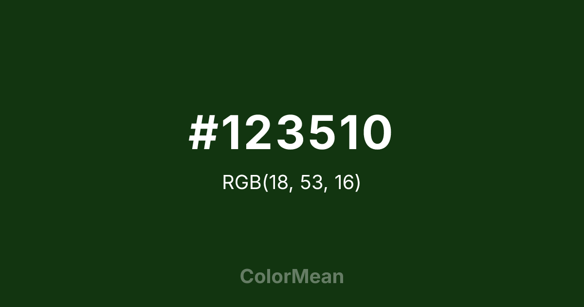 #123510 RGB value is (18, 53, 16). The hex color red value is 18, green is 53, and blue is 16. Its HSL format shows a hue of 117°, saturation of 54 percent, and lightness of 14 percent. The CMYK process values are 66 percent, 0 percent, 70 percent, 79 percent.