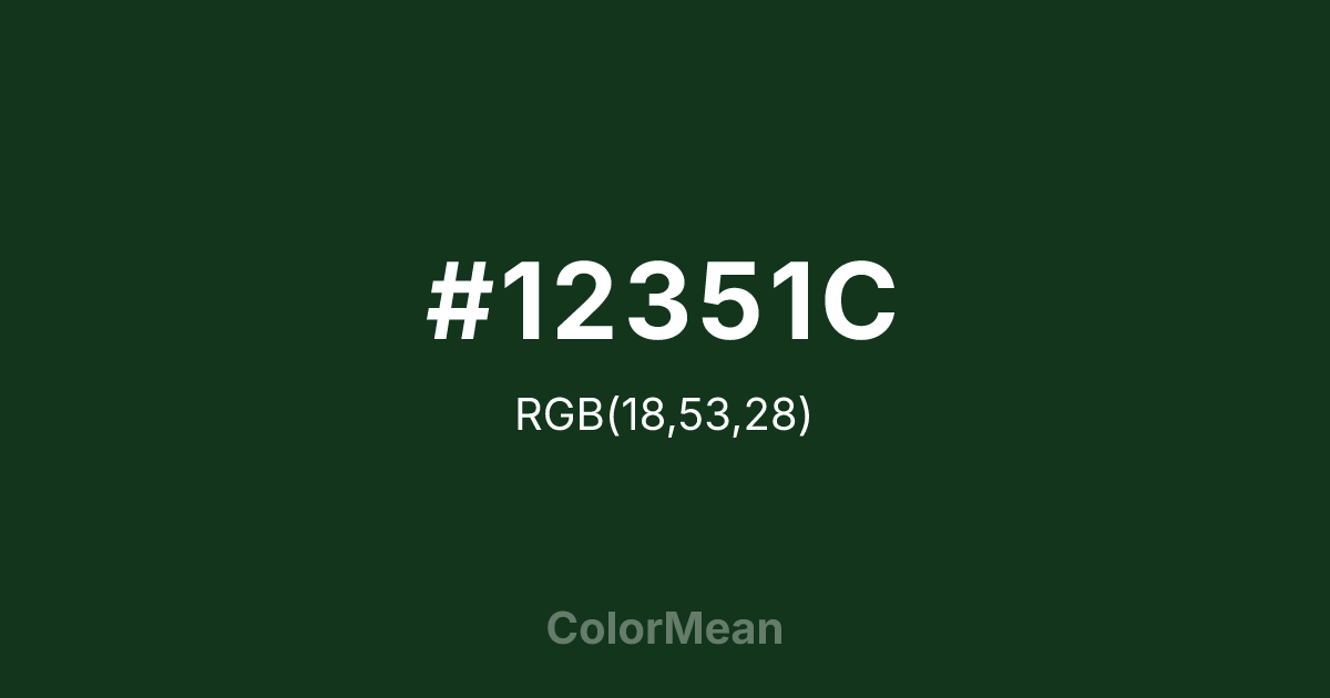 #12351C RGB value is (18, 53, 28). The hex color red value is 18, green is 53, and blue is 28. Its HSL format shows a hue of 137°, saturation of 49 percent, and lightness of 14 percent. The CMYK process values are 66 percent, 0 percent, 47 percent, 79 percent.