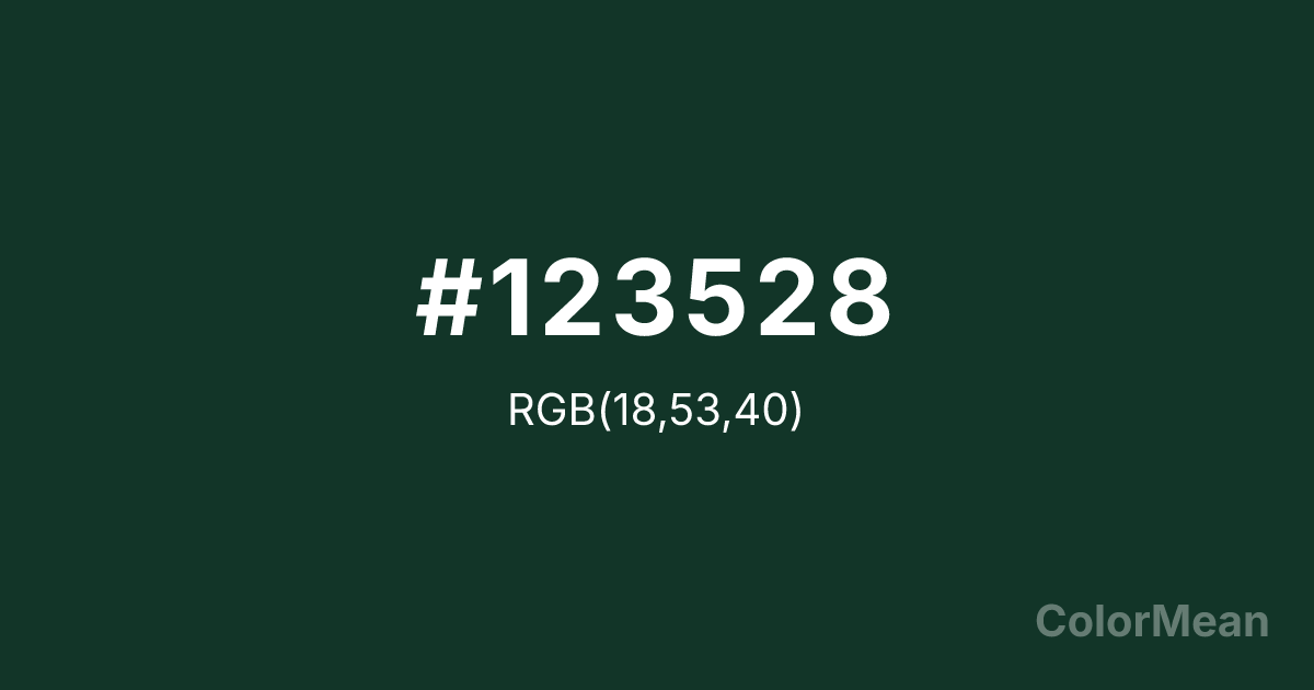 #123528 RGB value is (18, 53, 40). The hex color red value is 18, green is 53, and blue is 40. Its HSL format shows a hue of 158°, saturation of 49 percent, and lightness of 14 percent. The CMYK process values are 66 percent, 0 percent, 25 percent, 79 percent.