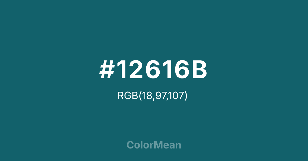 #12616B RGB value is (18, 97, 107). The hex color red value is 18, green is 97, and blue is 107. Its HSL format shows a hue of 187°, saturation of 71 percent, and lightness of 25 percent. The CMYK process values are 83 percent, 9 percent, 0 percent, 58 percent.