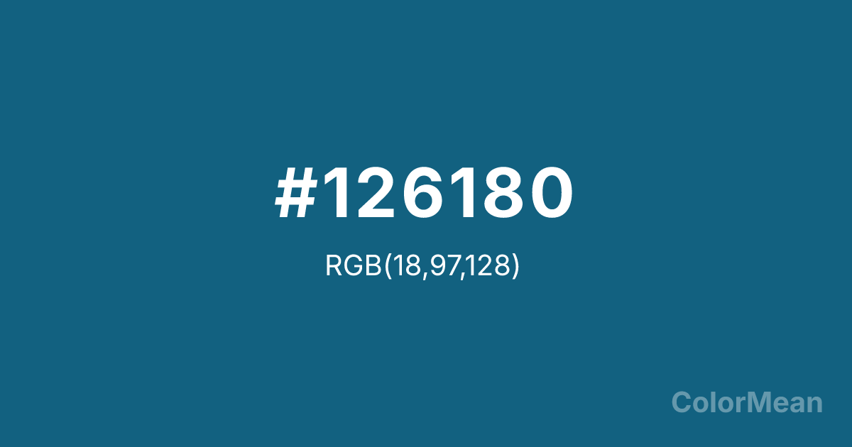 Blue Sapphire (#126180) RGB value is (18, 97, 128). The hex color red value is 18, green is 97, and blue is 128. Its HSL format shows a hue of 197°, saturation of 75 percent, and lightness of 29 percent. The CMYK process values are 86 percent, 24 percent, 0 percent, 50 percent.