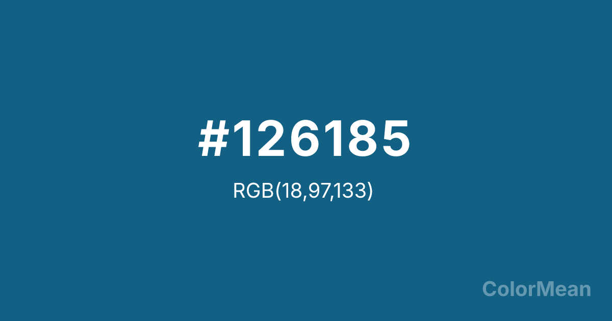 #126185 RGB value is (18, 97, 133). The hex color red value is 18, green is 97, and blue is 133. Its HSL format shows a hue of 199°, saturation of 76 percent, and lightness of 30 percent. The CMYK process values are 86 percent, 27 percent, 0 percent, 48 percent.