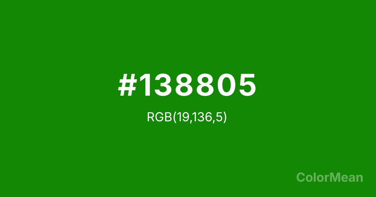 #138805 RGB value is (19, 136, 5). The hex color red value is 19, green is 136, and blue is 5. Its HSL format shows a hue of 114°, saturation of 93 percent, and lightness of 28 percent. The CMYK process values are 86 percent, 0 percent, 96 percent, 47 percent.