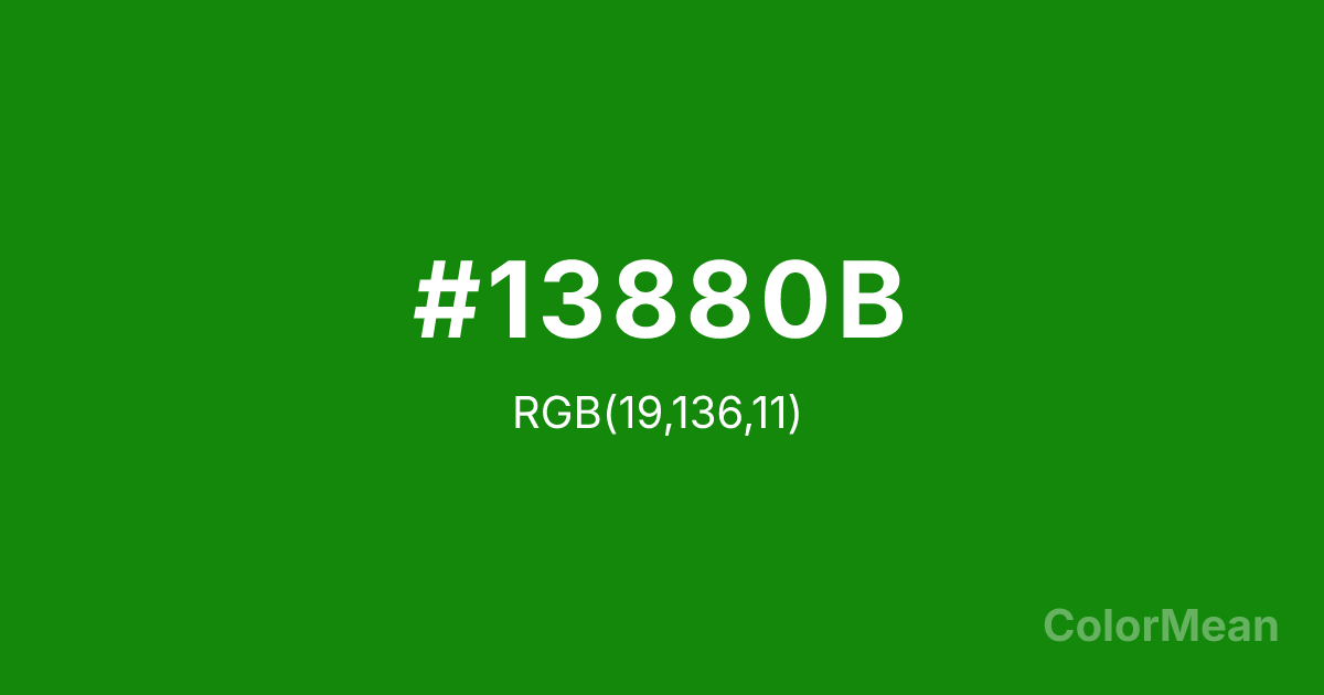 #13880B RGB value is (19, 136, 11). The hex color red value is 19, green is 136, and blue is 11. Its HSL format shows a hue of 116°, saturation of 85 percent, and lightness of 29 percent. The CMYK process values are 86 percent, 0 percent, 92 percent, 47 percent.