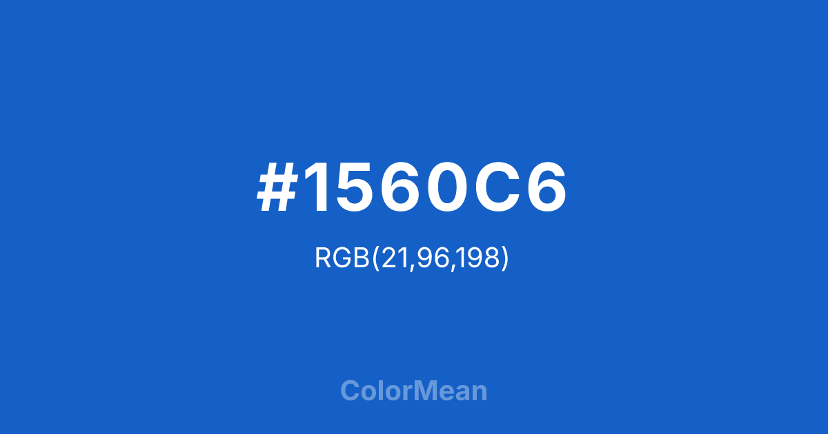 #1560C6 RGB value is (21, 96, 198). The hex color red value is 21, green is 96, and blue is 198. Its HSL format shows a hue of 215°, saturation of 81 percent, and lightness of 43 percent. The CMYK process values are 89 percent, 52 percent, 0 percent, 22 percent.