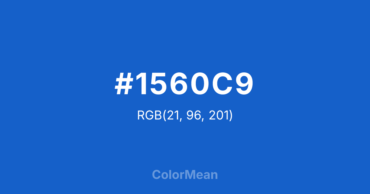 #1560C9 RGB value is (21, 96, 201). The hex color red value is 21, green is 96, and blue is 201. Its HSL format shows a hue of 215°, saturation of 81 percent, and lightness of 44 percent. The CMYK process values are 90 percent, 52 percent, 0 percent, 21 percent.