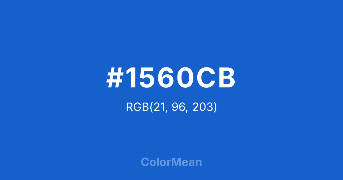 #1560CB RGB value is (21, 96, 203). The hex color red value is 21, green is 96, and blue is 203. Its HSL format shows a hue of 215°, saturation of 81 percent, and lightness of 44 percent. The CMYK process values are 90 percent, 53 percent, 0 percent, 20 percent.