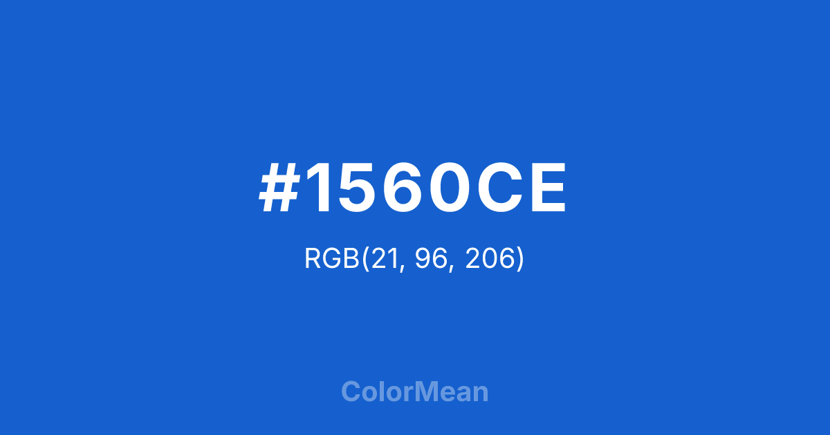 #1560CE RGB value is (21, 96, 206). The hex color red value is 21, green is 96, and blue is 206. Its HSL format shows a hue of 216°, saturation of 81 percent, and lightness of 45 percent. The CMYK process values are 90 percent, 53 percent, 0 percent, 19 percent.