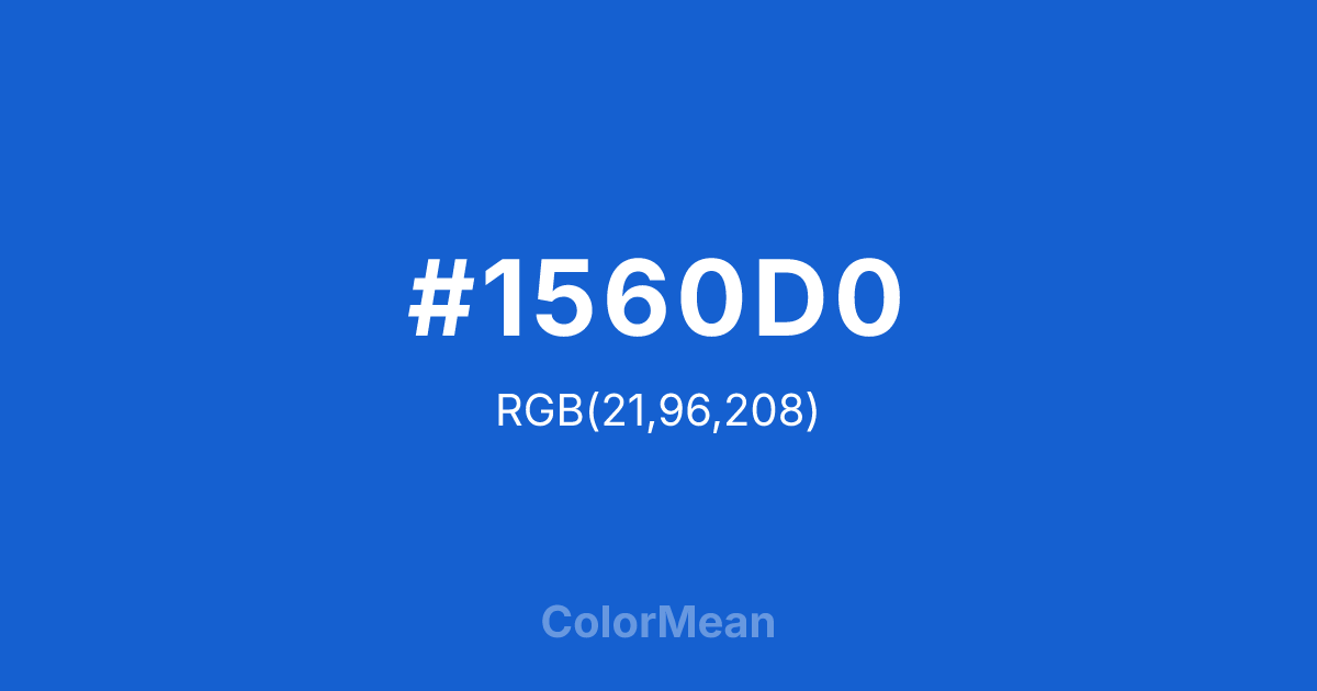 #1560D0 RGB value is (21, 96, 208). The hex color red value is 21, green is 96, and blue is 208. Its HSL format shows a hue of 216°, saturation of 82 percent, and lightness of 45 percent. The CMYK process values are 90 percent, 54 percent, 0 percent, 18 percent.