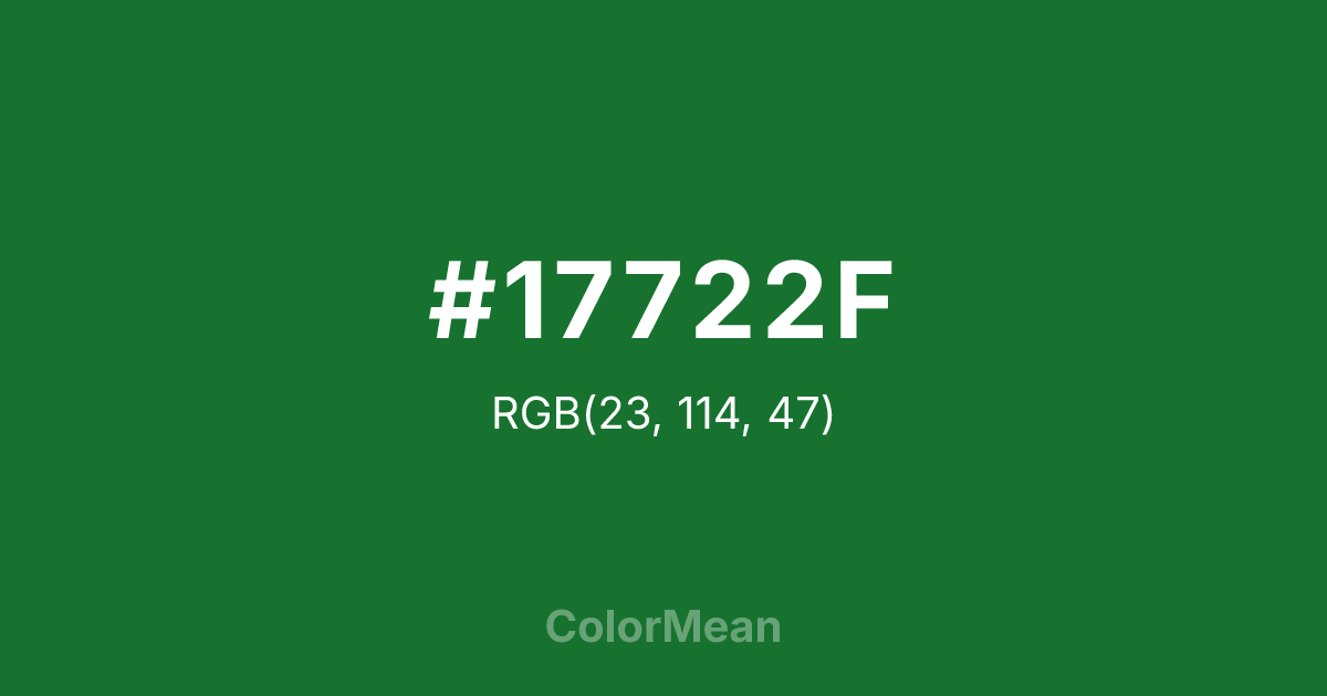 #17722F RGB value is (23, 114, 47). The hex color red value is 23, green is 114, and blue is 47. Its HSL format shows a hue of 136°, saturation of 66 percent, and lightness of 27 percent. The CMYK process values are 80 percent, 0 percent, 59 percent, 55 percent.