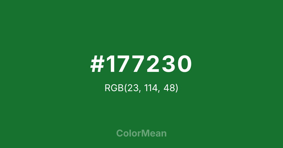 #177230 RGB value is (23, 114, 48). The hex color red value is 23, green is 114, and blue is 48. Its HSL format shows a hue of 136°, saturation of 66 percent, and lightness of 27 percent. The CMYK process values are 80 percent, 0 percent, 58 percent, 55 percent.