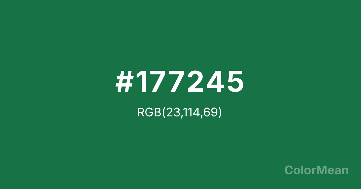 Dark Spring Green (#177245) RGB value is (23, 114, 69). The hex color red value is 23, green is 114, and blue is 69. Its HSL format shows a hue of 150°, saturation of 66 percent, and lightness of 27 percent. The CMYK process values are 80 percent, 0 percent, 39 percent, 55 percent.