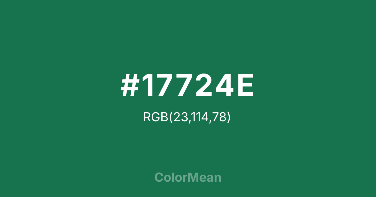 #17724E RGB value is (23, 114, 78). The hex color red value is 23, green is 114, and blue is 78. Its HSL format shows a hue of 156°, saturation of 66 percent, and lightness of 27 percent. The CMYK process values are 80 percent, 0 percent, 32 percent, 55 percent.