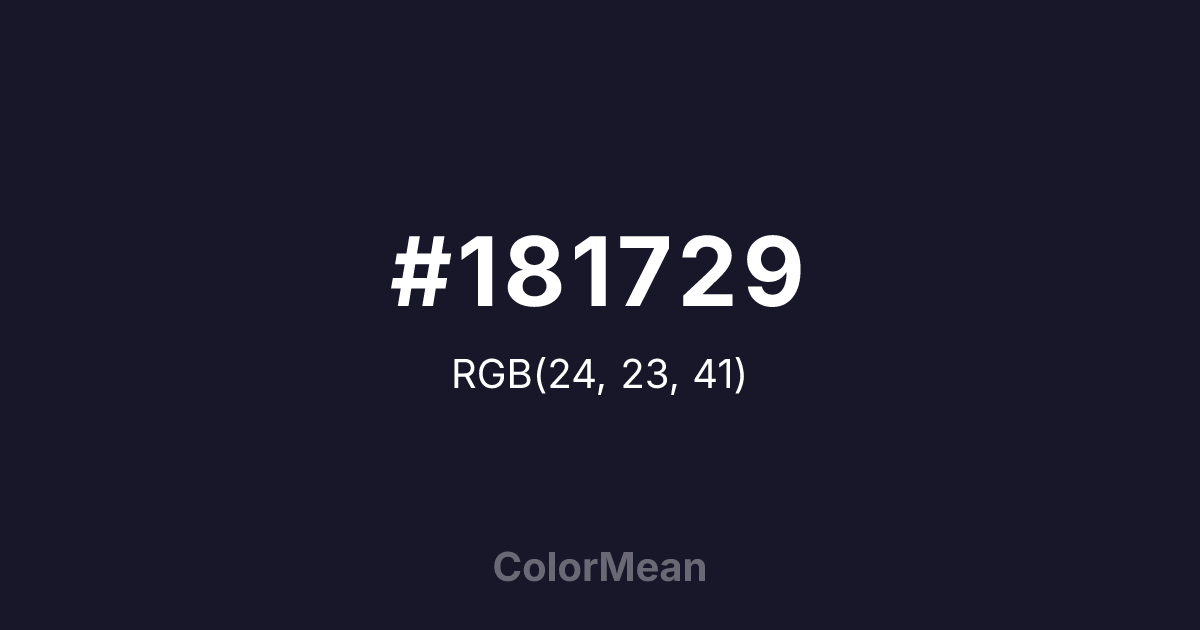 #181729 RGB value is (24, 23, 41). The hex color red value is 24, green is 23, and blue is 41. Its HSL format shows a hue of 243°, saturation of 28 percent, and lightness of 13 percent. The CMYK process values are 41 percent, 44 percent, 0 percent, 84 percent.