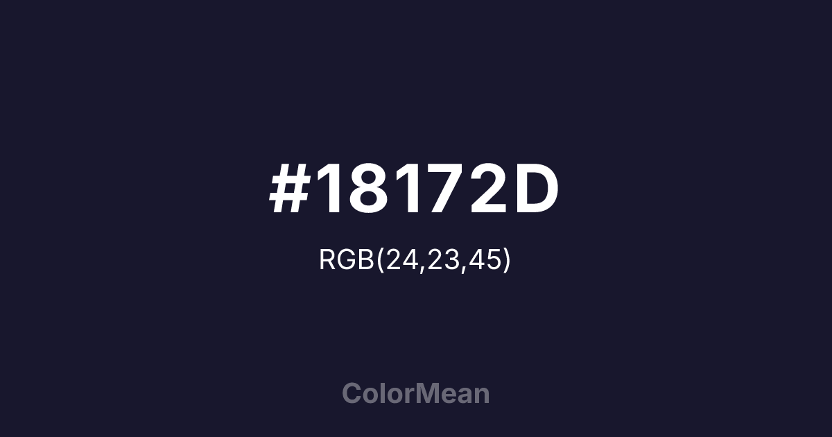 #18172D RGB value is (24, 23, 45). The hex color red value is 24, green is 23, and blue is 45. Its HSL format shows a hue of 243°, saturation of 32 percent, and lightness of 13 percent. The CMYK process values are 47 percent, 49 percent, 0 percent, 82 percent.