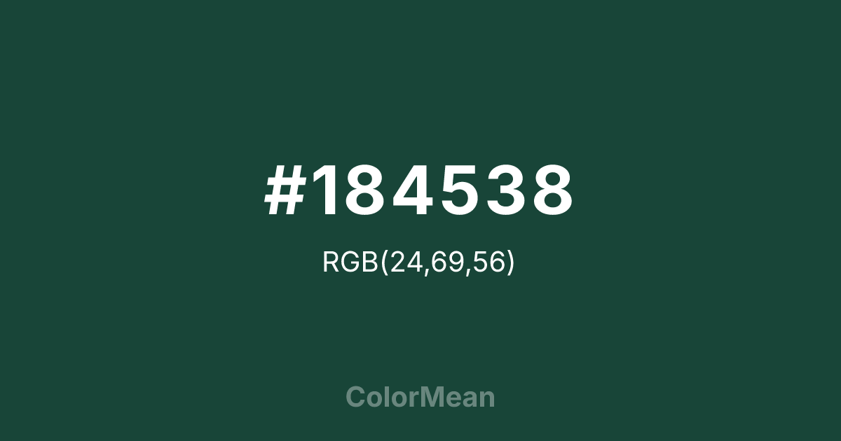 #184538 RGB value is (24, 69, 56). The hex color red value is 24, green is 69, and blue is 56. Its HSL format shows a hue of 163°, saturation of 48 percent, and lightness of 18 percent. The CMYK process values are 65 percent, 0 percent, 19 percent, 73 percent.