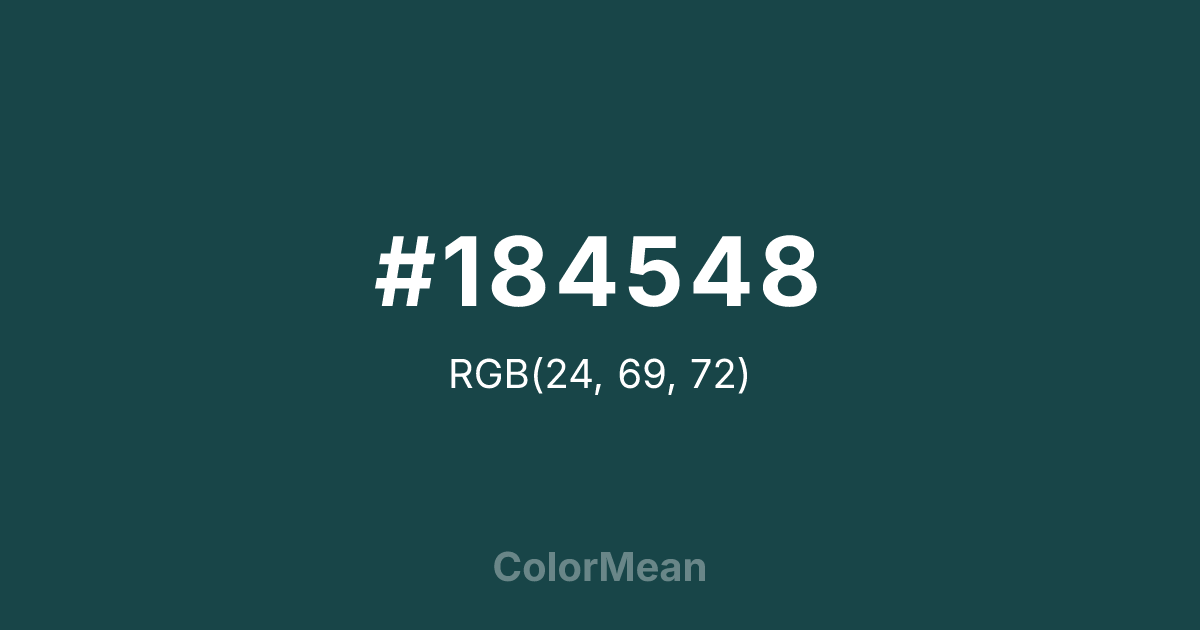 #184548 RGB value is (24, 69, 72). The hex color red value is 24, green is 69, and blue is 72. Its HSL format shows a hue of 184°, saturation of 50 percent, and lightness of 19 percent. The CMYK process values are 67 percent, 4 percent, 0 percent, 72 percent.