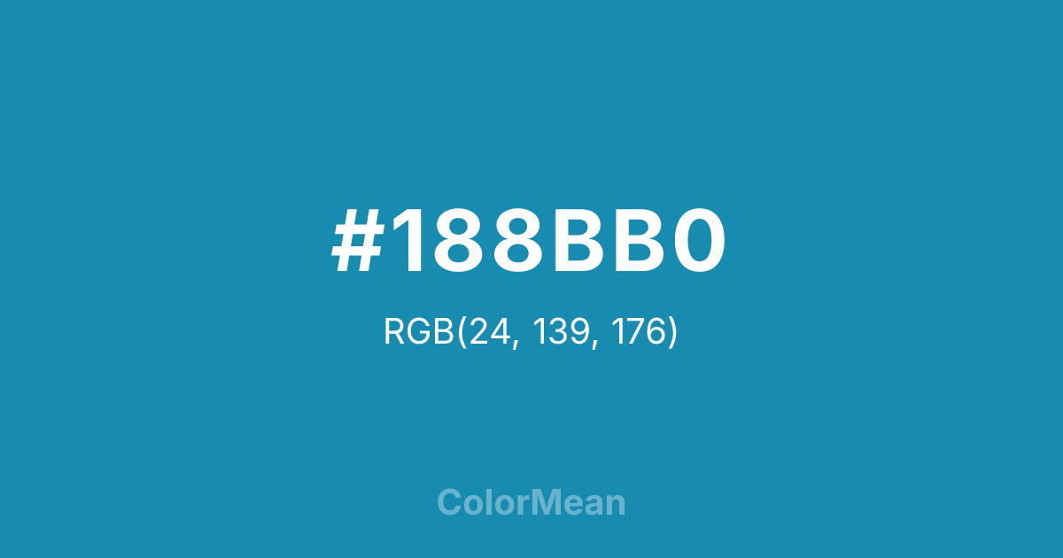 #188BB0 RGB value is (24, 139, 176). The hex color red value is 24, green is 139, and blue is 176. Its HSL format shows a hue of 195°, saturation of 76 percent, and lightness of 39 percent. The CMYK process values are 86 percent, 21 percent, 0 percent, 31 percent.