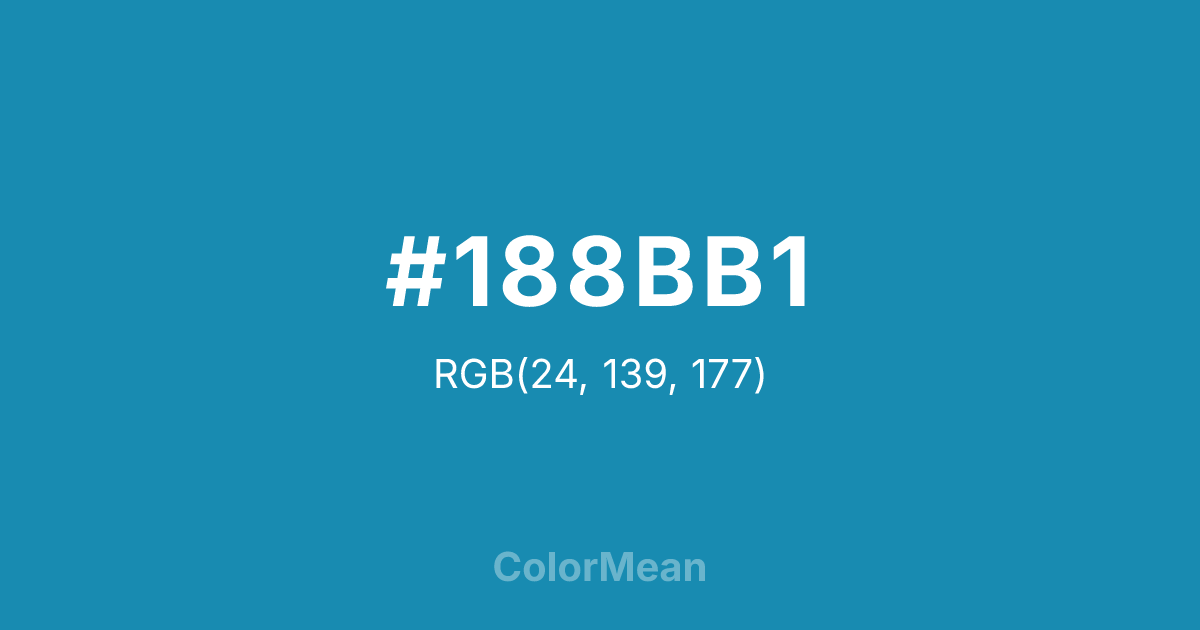 #188BB1 RGB value is (24, 139, 177). The hex color red value is 24, green is 139, and blue is 177. Its HSL format shows a hue of 195°, saturation of 76 percent, and lightness of 39 percent. The CMYK process values are 86 percent, 21 percent, 0 percent, 31 percent.