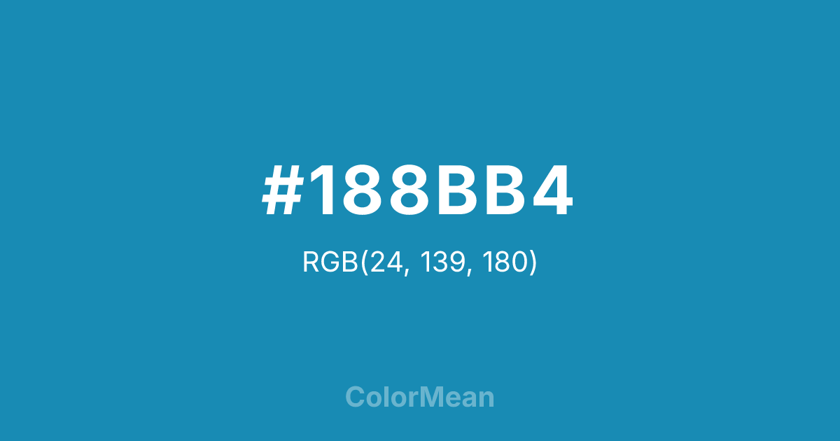#188BB4 RGB value is (24, 139, 180). The hex color red value is 24, green is 139, and blue is 180. Its HSL format shows a hue of 196°, saturation of 76 percent, and lightness of 40 percent. The CMYK process values are 87 percent, 23 percent, 0 percent, 29 percent.