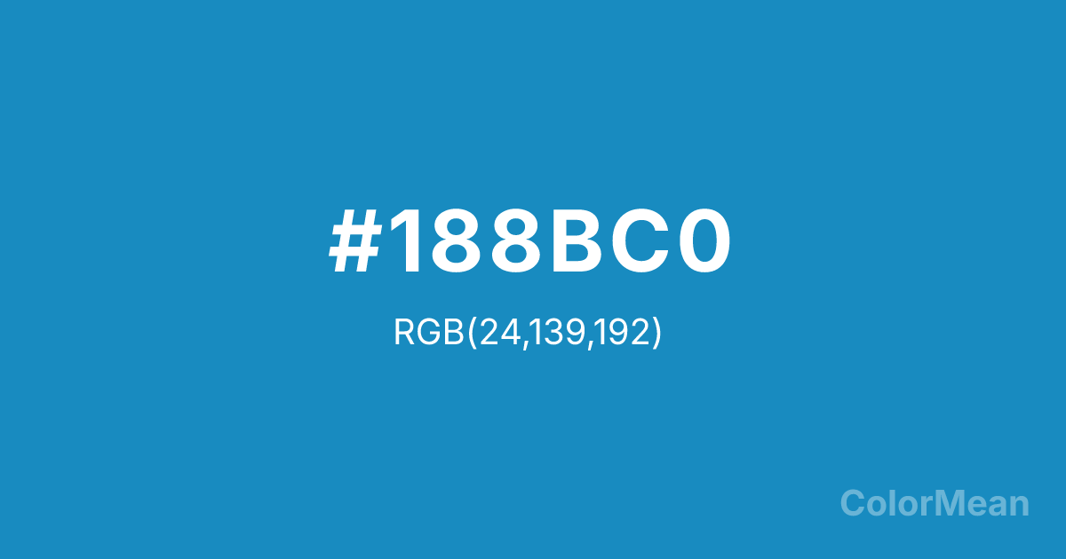 #188BC0 RGB value is (24, 139, 192). The hex color red value is 24, green is 139, and blue is 192. Its HSL format shows a hue of 199°, saturation of 78 percent, and lightness of 42 percent. The CMYK process values are 88 percent, 28 percent, 0 percent, 25 percent.