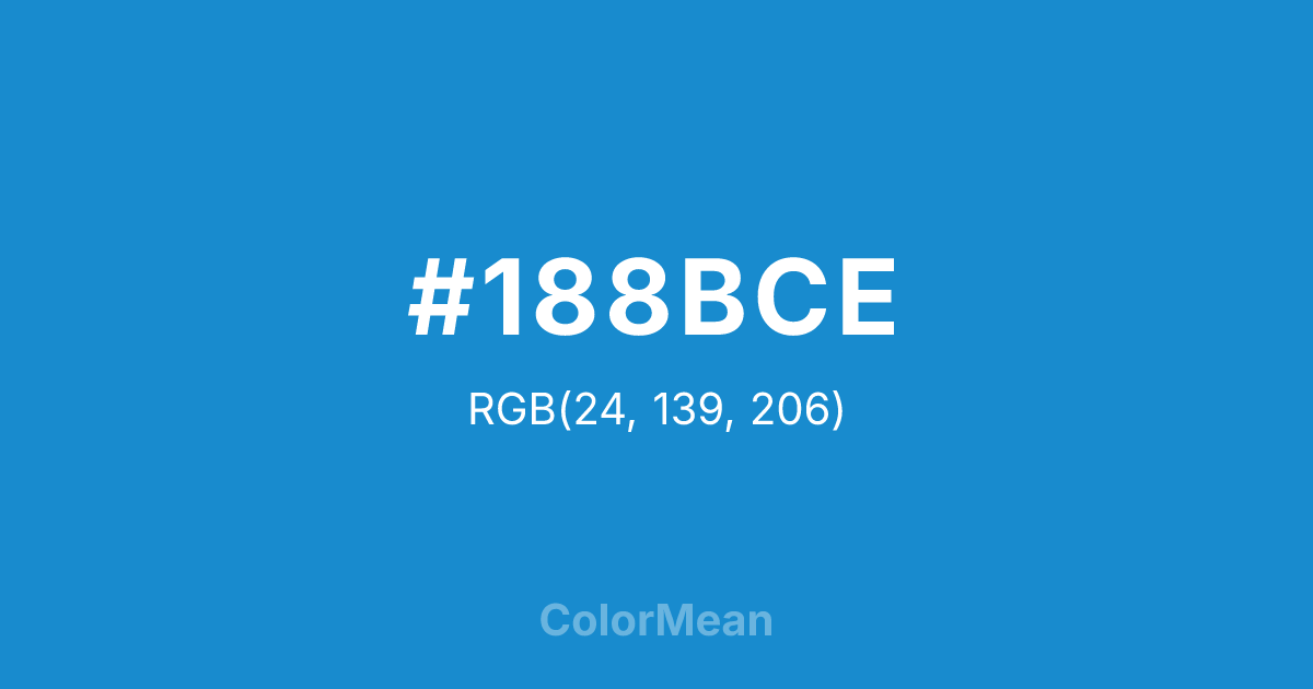 #188BCE RGB value is (24, 139, 206). The hex color red value is 24, green is 139, and blue is 206. Its HSL format shows a hue of 202°, saturation of 79 percent, and lightness of 45 percent. The CMYK process values are 88 percent, 33 percent, 0 percent, 19 percent.
