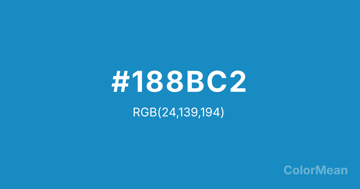 Cyan Cornflower Blue (#188BC2) RGB value is (24, 139, 194). The hex color red value is 24, green is 139, and blue is 194. Its HSL format shows a hue of 199°, saturation of 78 percent, and lightness of 43 percent. The CMYK process values are 88 percent, 28 percent, 0 percent, 24 percent.