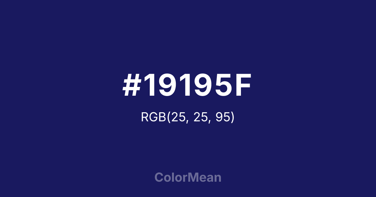 #19195F RGB value is (25, 25, 95). The hex color red value is 25, green is 25, and blue is 95. Its HSL format shows a hue of 240°, saturation of 58 percent, and lightness of 24 percent. The CMYK process values are 74 percent, 74 percent, 0 percent, 63 percent.