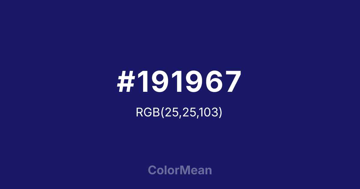 #191967 RGB value is (25, 25, 103). The hex color red value is 25, green is 25, and blue is 103. Its HSL format shows a hue of 240°, saturation of 61 percent, and lightness of 25 percent. The CMYK process values are 76 percent, 76 percent, 0 percent, 60 percent.