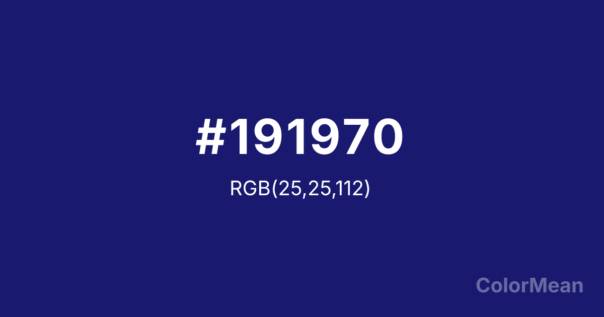 Midnight Blue (#191970) RGB value is (25, 25, 112). The hex color red value is 25, green is 25, and blue is 112. Its HSL format shows a hue of 240°, saturation of 64 percent, and lightness of 27 percent. The CMYK process values are 78 percent, 78 percent, 0 percent, 56 percent.