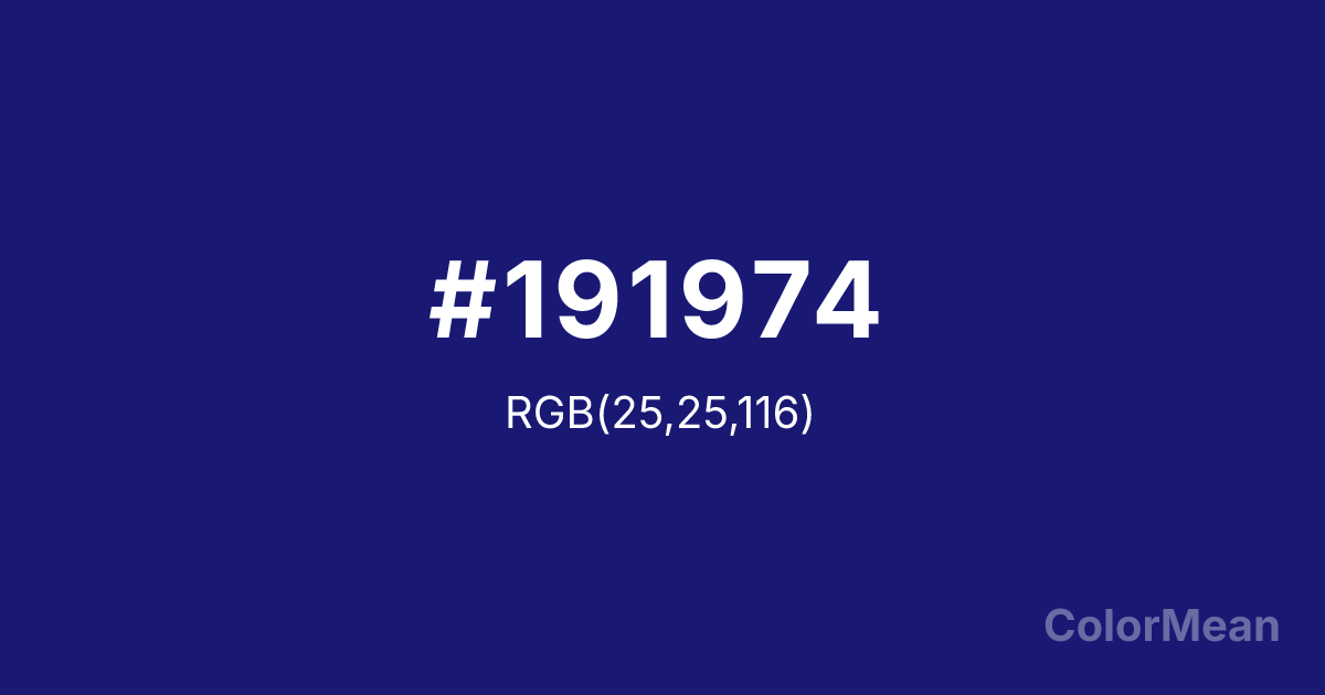 #191974 RGB value is (25, 25, 116). The hex color red value is 25, green is 25, and blue is 116. Its HSL format shows a hue of 240°, saturation of 65 percent, and lightness of 28 percent. The CMYK process values are 78 percent, 78 percent, 0 percent, 55 percent.
