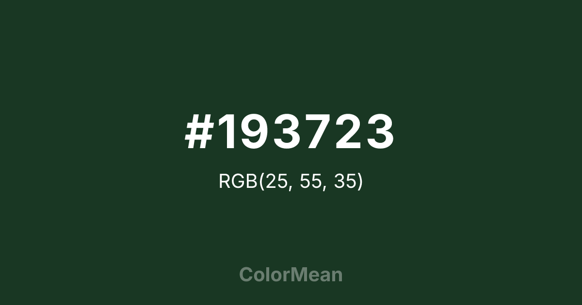 #193723 RGB value is (25, 55, 35). The hex color red value is 25, green is 55, and blue is 35. Its HSL format shows a hue of 140°, saturation of 38 percent, and lightness of 16 percent. The CMYK process values are 55 percent, 0 percent, 36 percent, 78 percent.