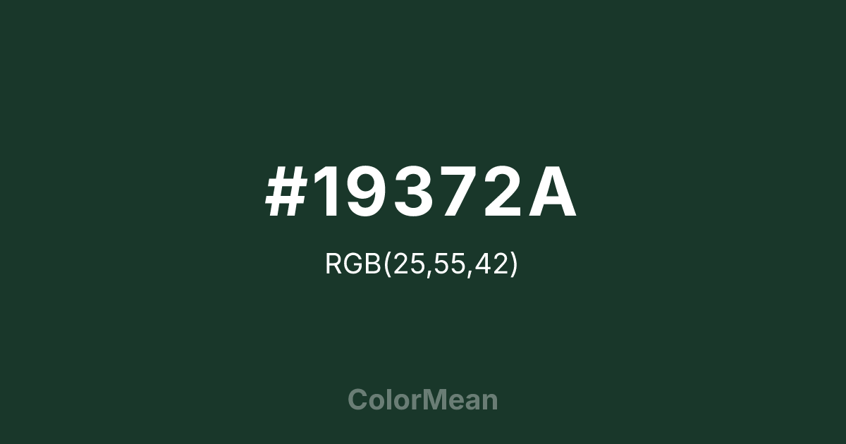 #19372A RGB value is (25, 55, 42). The hex color red value is 25, green is 55, and blue is 42. Its HSL format shows a hue of 154°, saturation of 38 percent, and lightness of 16 percent. The CMYK process values are 55 percent, 0 percent, 24 percent, 78 percent.