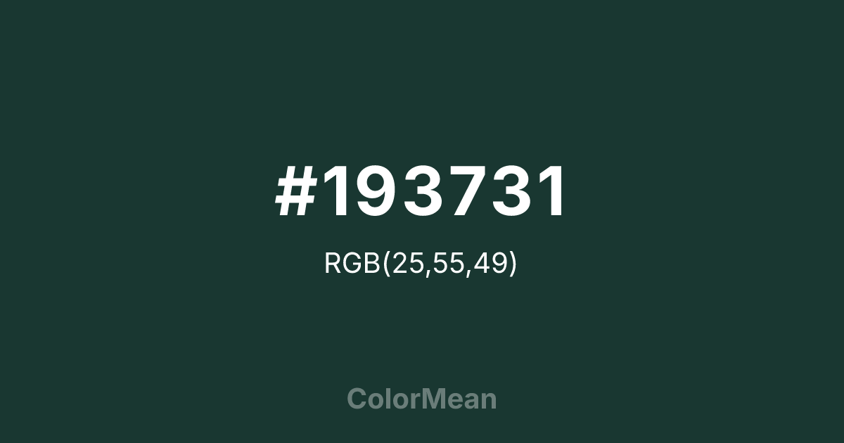 #193731 RGB value is (25, 55, 49). The hex color red value is 25, green is 55, and blue is 49. Its HSL format shows a hue of 168°, saturation of 38 percent, and lightness of 16 percent. The CMYK process values are 55 percent, 0 percent, 11 percent, 78 percent.