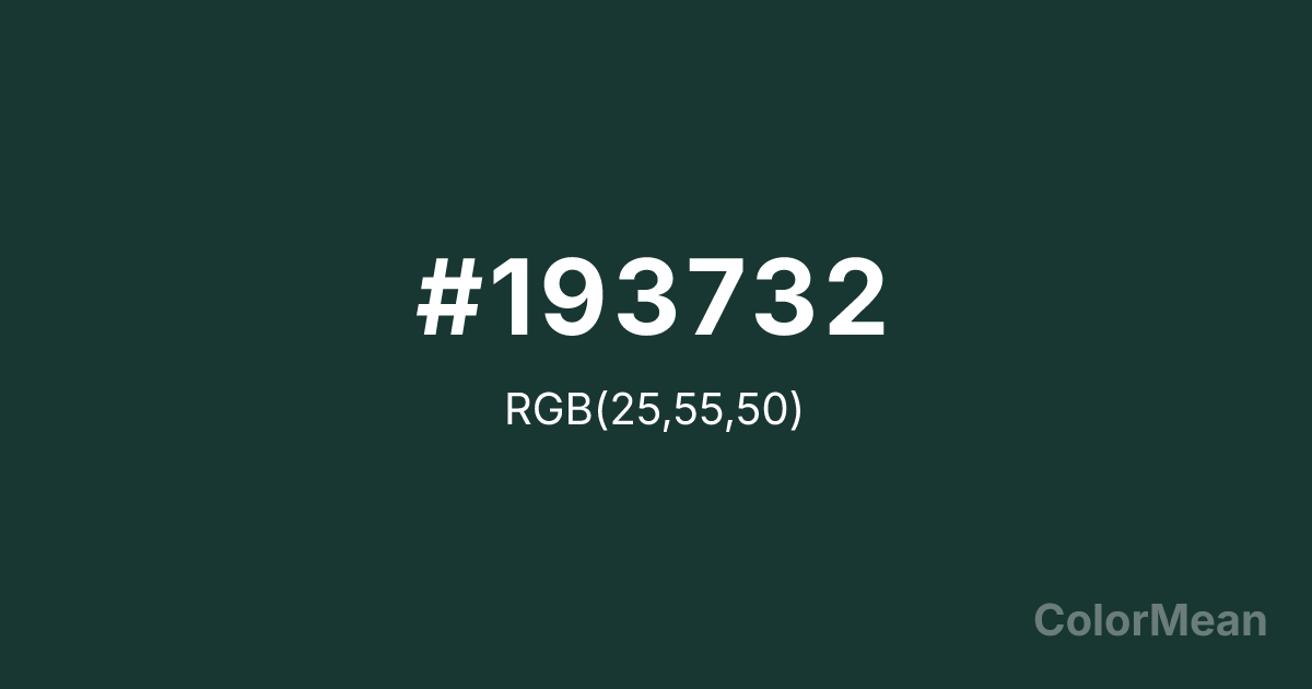#193732 RGB value is (25, 55, 50). The hex color red value is 25, green is 55, and blue is 50. Its HSL format shows a hue of 170°, saturation of 38 percent, and lightness of 16 percent. The CMYK process values are 55 percent, 0 percent, 9 percent, 78 percent.