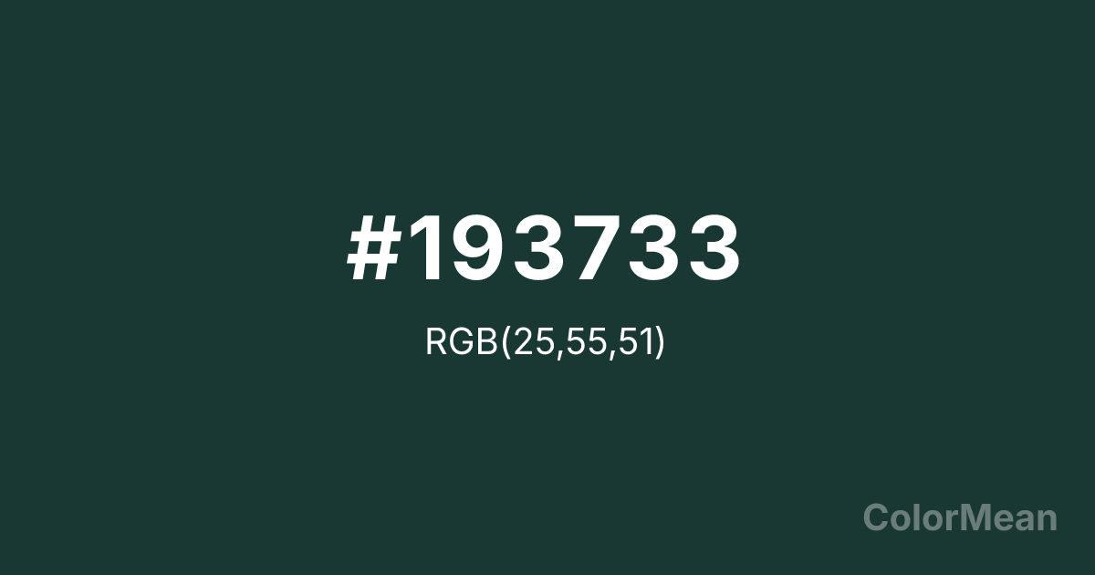 #193733 RGB value is (25, 55, 51). The hex color red value is 25, green is 55, and blue is 51. Its HSL format shows a hue of 172°, saturation of 38 percent, and lightness of 16 percent. The CMYK process values are 55 percent, 0 percent, 7 percent, 78 percent.